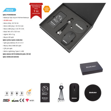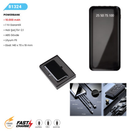 POWERBANK Lityum Pil 10.000 mAh Hızlı Şarj 5V-2.1A 3 in 1 Kablo Ebat: 132 x 65 x 15 mm