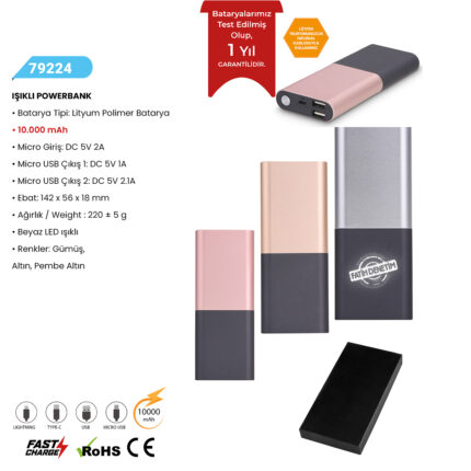 IŞIKLI POWERBANK Batarya Tipi: Lityum Polimer Batarya 10.000 mAh Micro Giriş: DC 5V 2A Micro USB Çıkış 1: DC 5V
