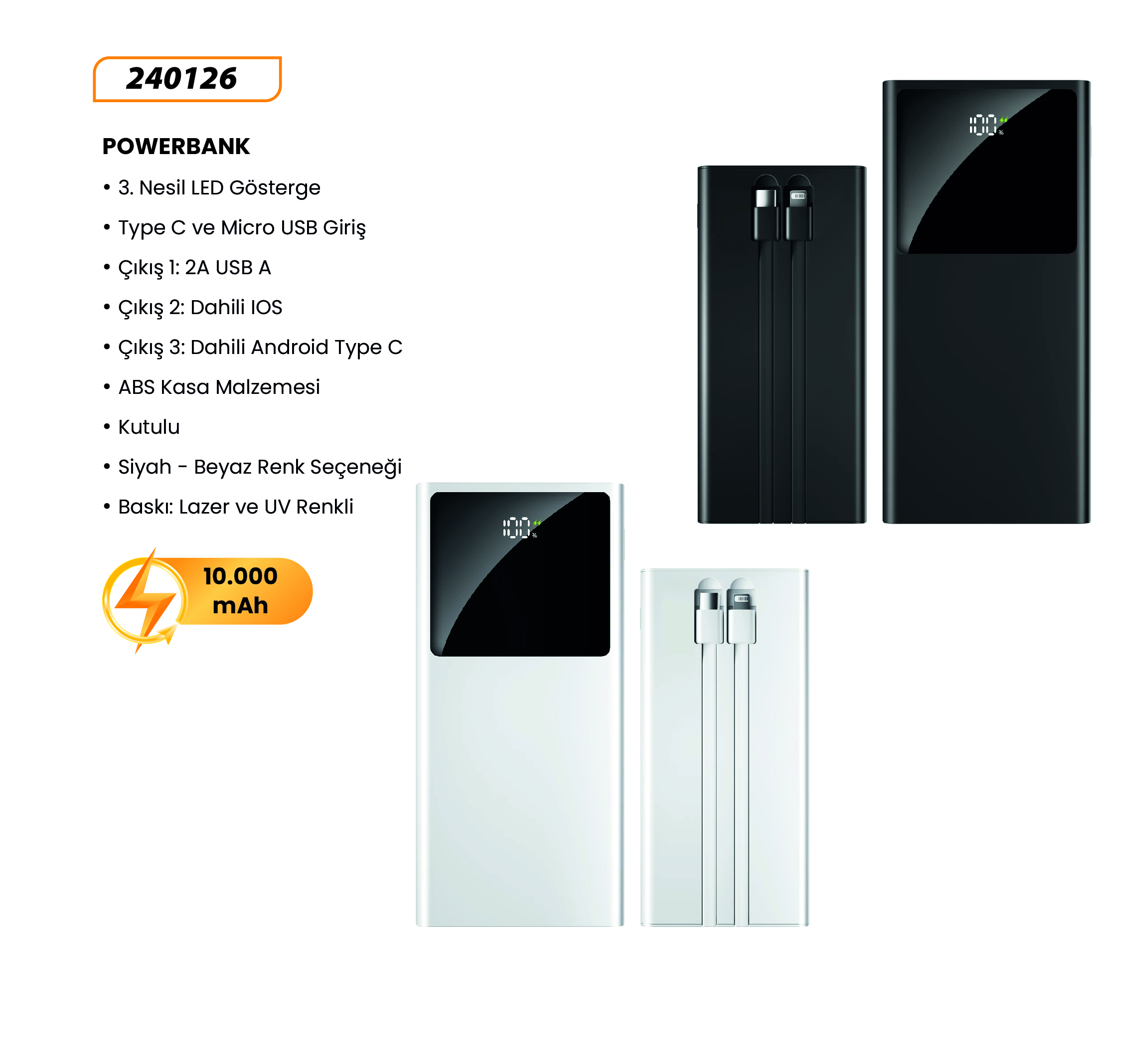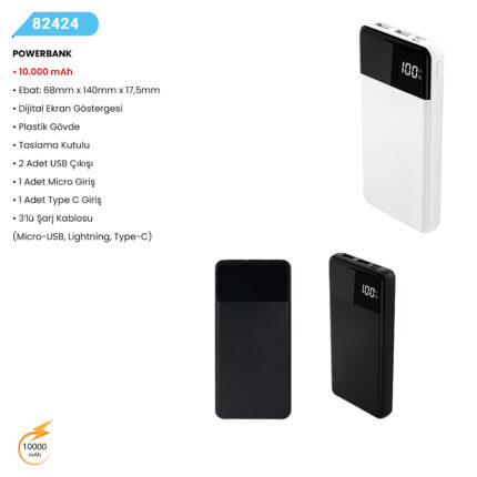 POWERBANK 10.000 mAh Ebat: 68mm x 140mm x 17,5mm Dijital Ekran Göstergesi Plastik Gövde Taslama Kutulu 2 Adet USB Çıkışı