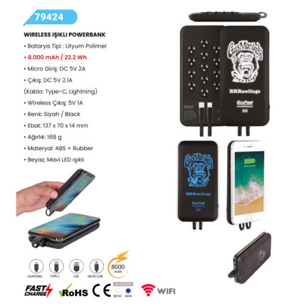 WIRELESS POWERBANK Batarya: A+ Lithium Polymer 10.000 mAh Baskı Alanı: Ön Yüz Işıklı Baskı/Beyaz Işık Wireless: %100 Bakır Devre Gösterge: