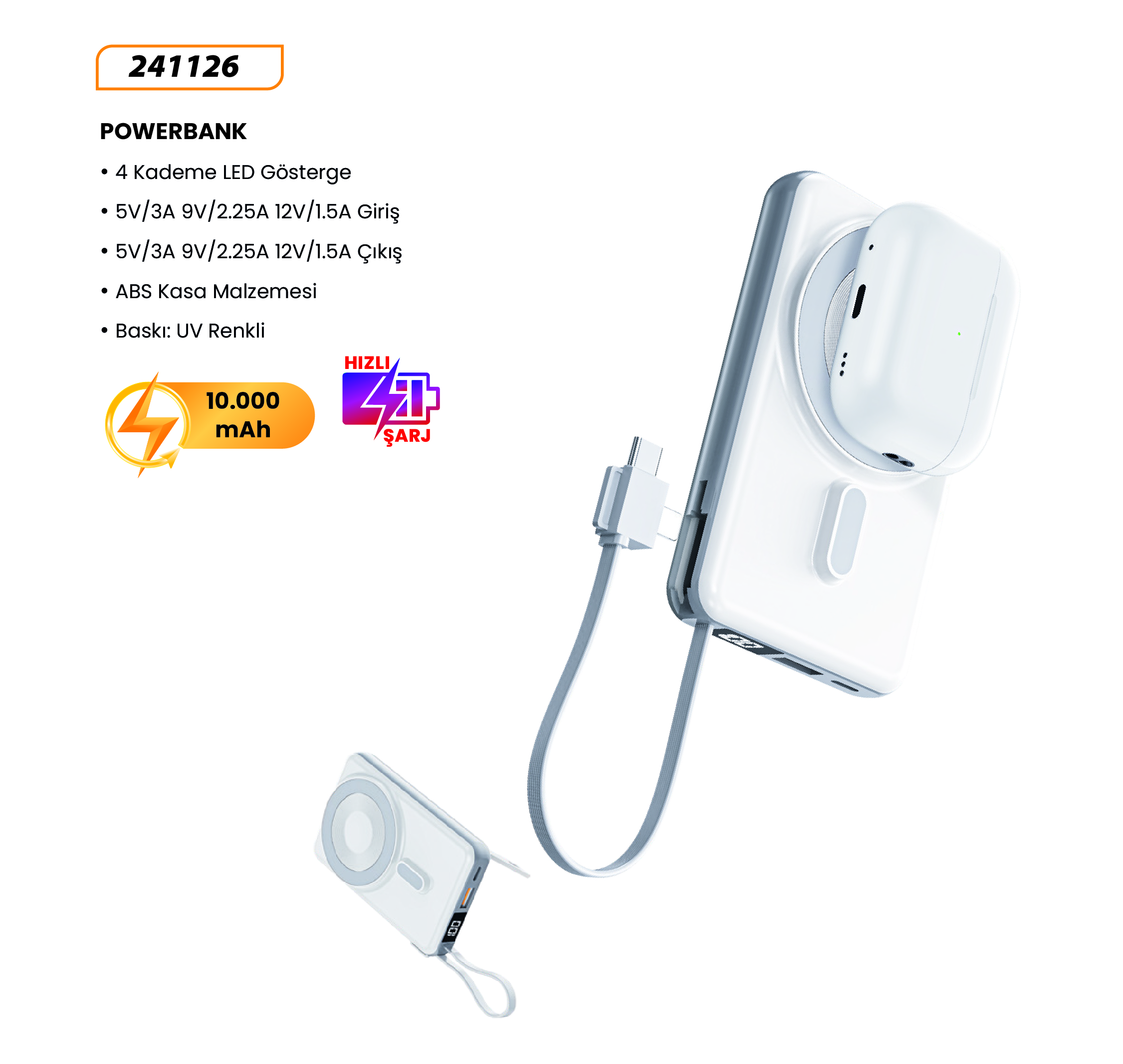 POWERBANK Lityum Pil 10.000 mAh Hızlı Şarj 5V-2.1A 3 in 1 Kablo Ebat: 132 x 65 x 15 mm