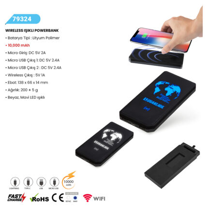 WIRELESS IŞIKLI POWERBANK Batarya Tipi: Lityum Polimer 10,000 mAh Micro Giriş: DC 5V 2A Micro USB Çıkış 1: DC 5V