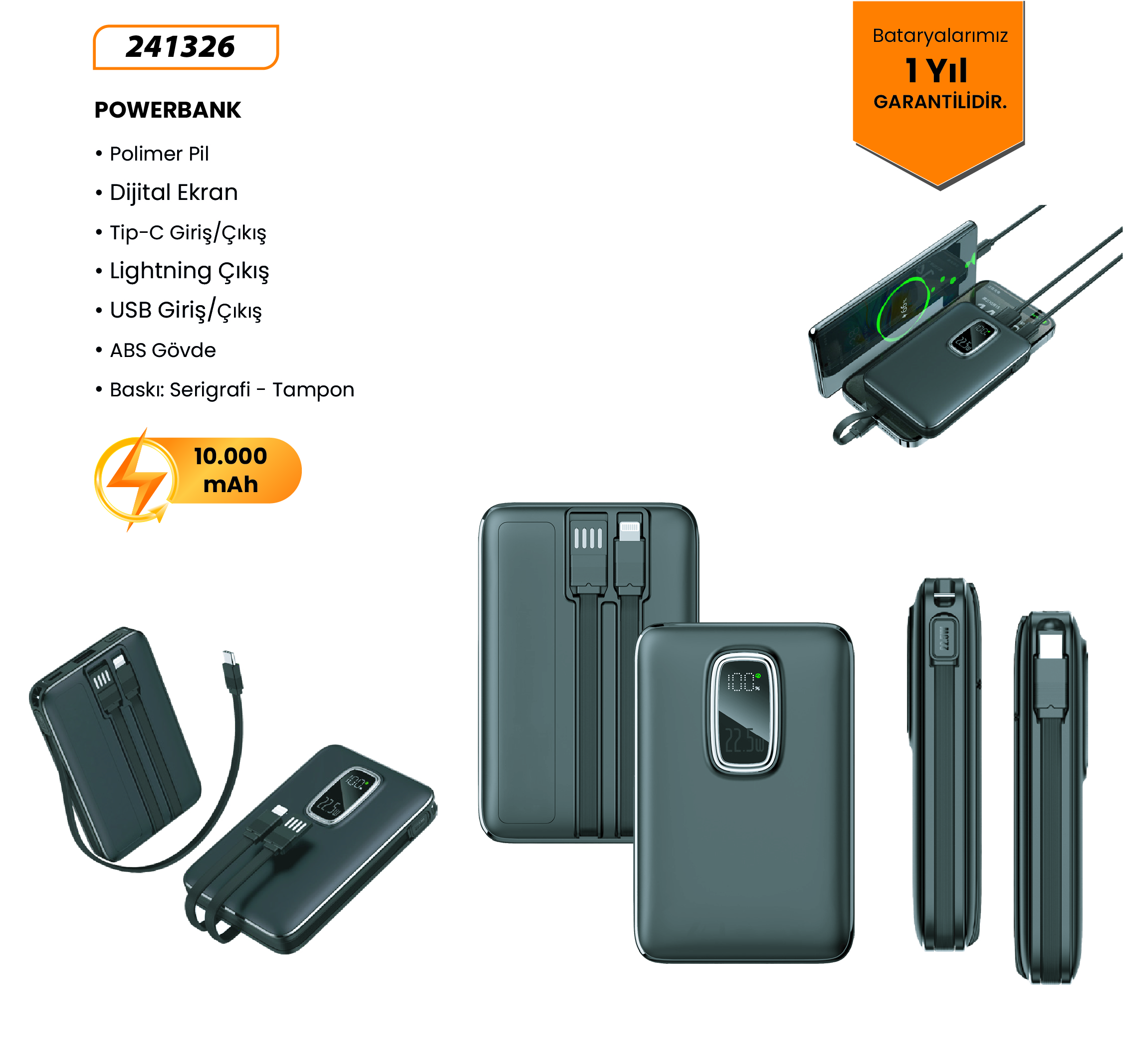 WIRELESS POWERBANK Batarya: A+ Lithium Polymer 10.000 mAh Baskı Alanı: Ön Yüz Işıklı Baskı/Beyaz Işık Wireless: %100 Bakır Devre Gösterge: