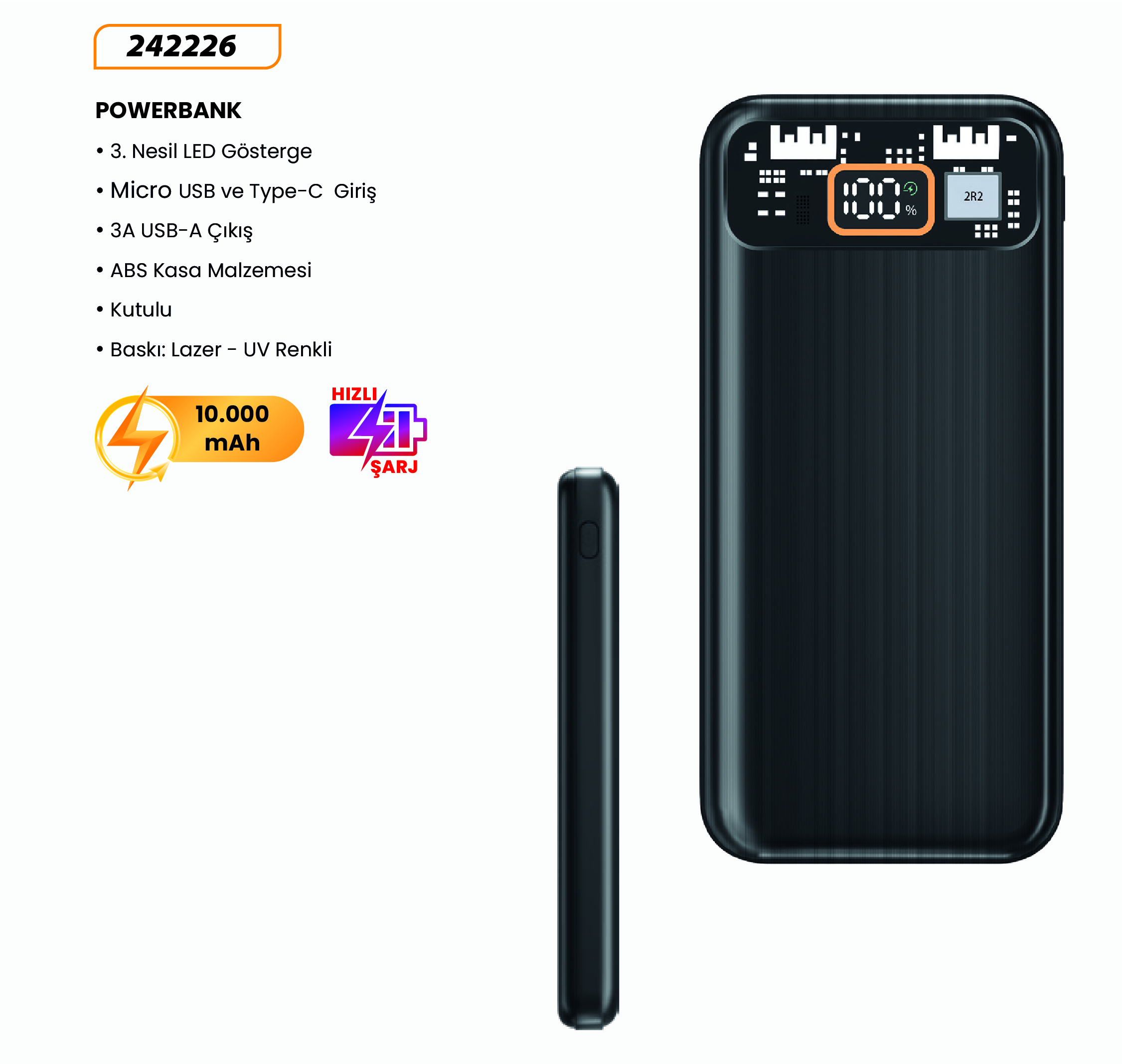 POWERBANK 10.000 mAh Ebat: 68mm x 140mm x 17,5mm Dijital Ekran Göstergesi Plastik Gövde Taslama Kutulu 2 Adet USB Çıkışı