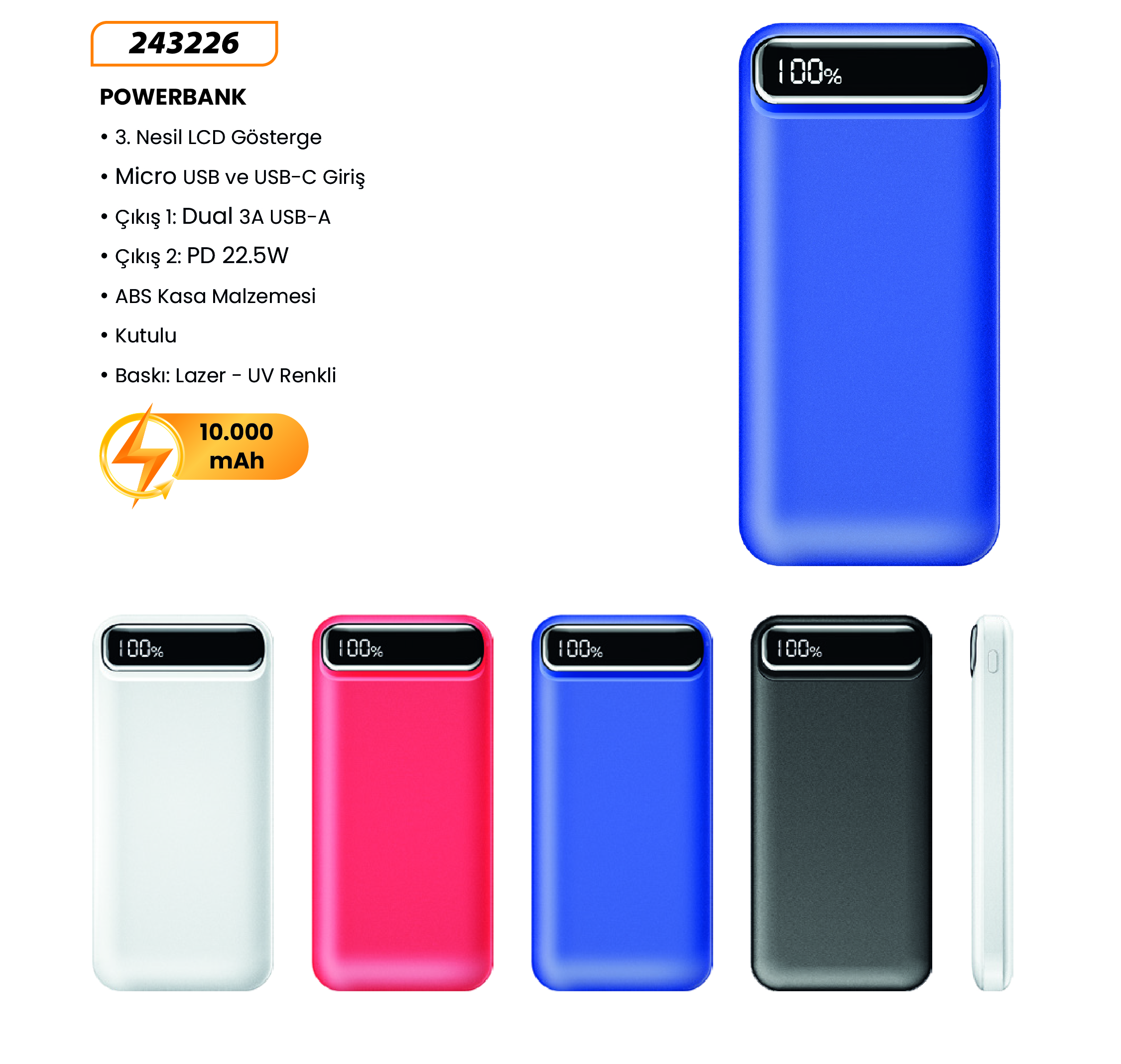 POWERBANK 10.000 mAh Ebat: 68,8mm x 140mm x 17,5 mm . Plastik Gövde Dijital Ekran Göstergesi Wireless Kablosuz Şarj Dahili