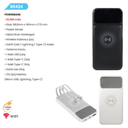 POWERBANK 10.000 mAh Ebat: 68,8mm x 140mm x 17,5 mm . Plastik Gövde Dijital Ekran Göstergesi Wireless Kablosuz Şarj Dahili