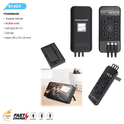 POWERBANK Lityum Pil 10.000 mAh Hızlı Şarj 5V-2.1A 3 in 1 Kablo Ebat: 132 x 65 x 15 mm