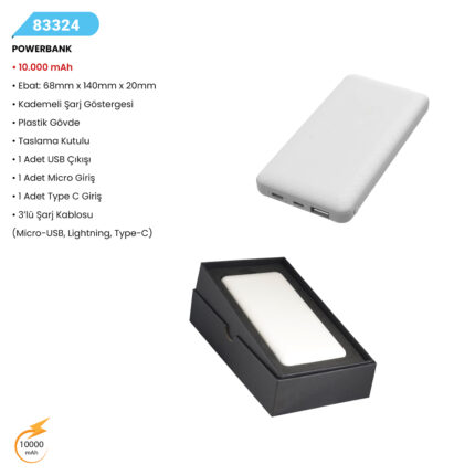 10.000 mAh Ebat: 68mm x 140mm x 20mm Kademeli Şarj Göstergesi Plastik Gövde Taslama Kutulu 1 Adet USB Çıkışı 1