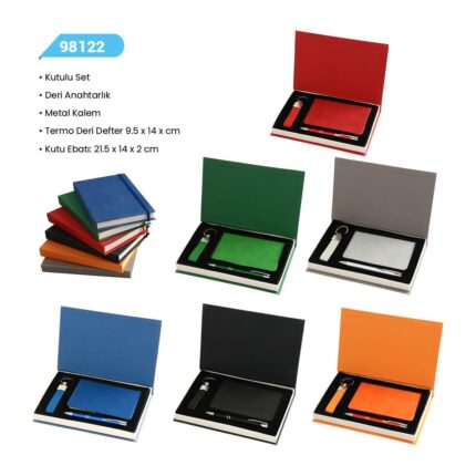 • Kutulu Set • Deri Anahtarlık • Metal Kalem • Termo Deri Defter 9.5 x 14 x cm • Kutu