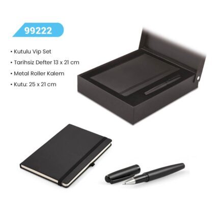 • Kutulu Vip Set • Tarihsiz Defter 13 x 21 cm • Metal Roller Kalem • Kutu: 25 x 21