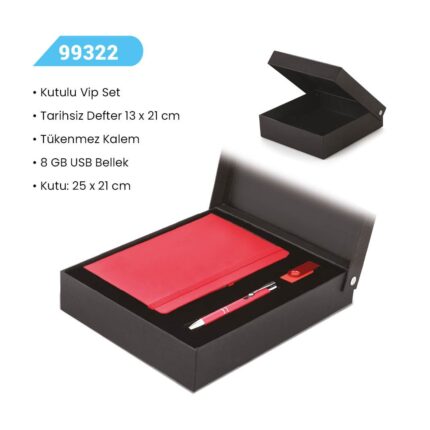 • Kutulu Vip Set • Tarihsiz Defter 13 x 21 cm • Tükenmez Kalem • 8 GB USB Bellek •