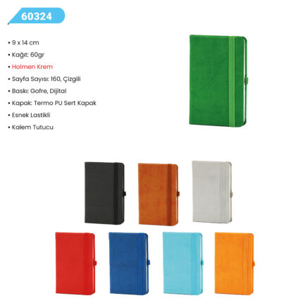 9 x 14 Kağıt: 60gr. Holmen Krem Sayfa Sayısı: 160 Çizgili. Baskı: Gofre-Dijital Kapak: Termo PU Sert Kapak Esnek Lastikli