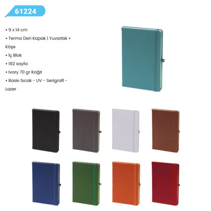 9 x 14 Termo Deri Kapak – Yuvarlak Köşe Kağıt: 70gr. Ivory Sayfa Sayısı: 192 Çizgili. Baskı: Sıcak-UV-Serigrafi-Lazer İç Blok