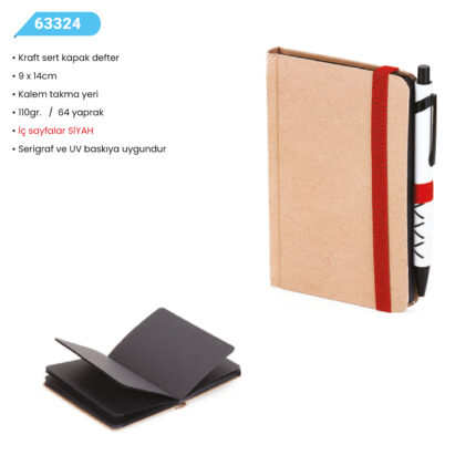 Kraft Sert Kapak Defter 9×14 Kalem Takma Yeri 110gr – 64 Yaprak İç Sayfalar Siyah Serigrafi – UV