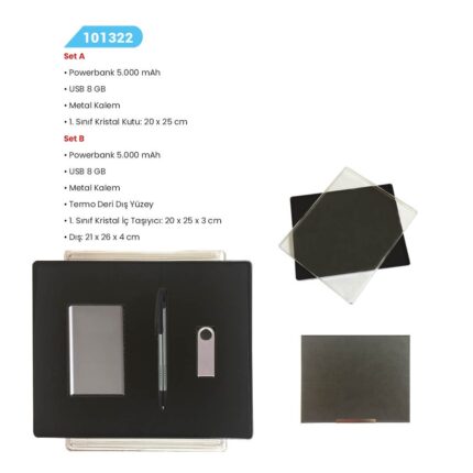 Set A • Powerbank 5.000 mAh • USB 8 GB • Metal Kalem • 1. Sınıf Kristal Kutu: 20 x