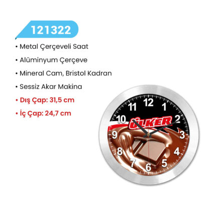• Metal Çerçeveli Saat • Alüminyum Çerçeve • Mineral Cam • Metal Üstü Serigraf Baskı • Sessiz Akar Makina •