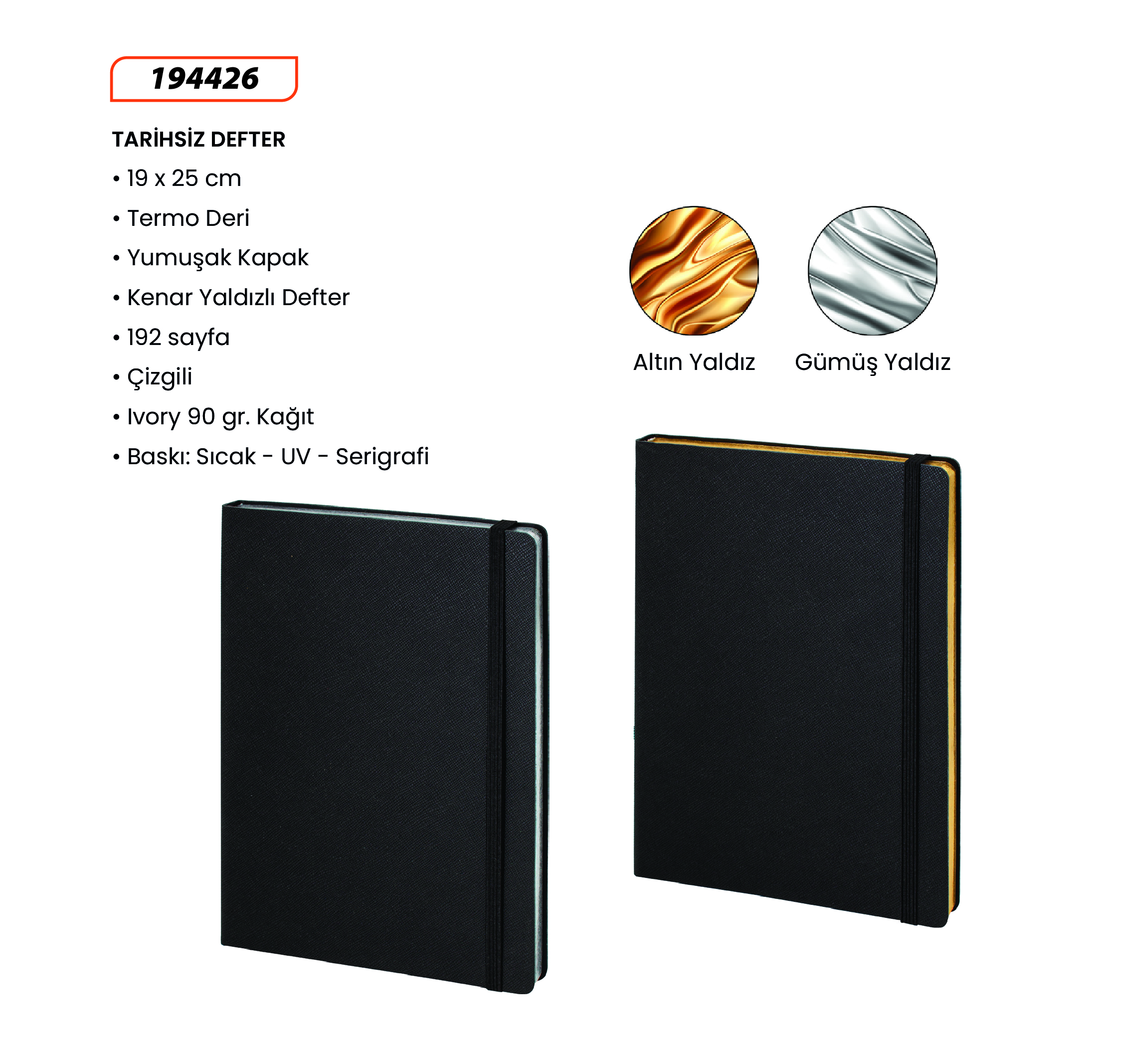 13 x 21 Kağıt: 70gr. Ivory Krem Sayfa Sayısı: 196 Çizgili. Baskı: Gofre-Dijital Kapak: Termo PU Sert Kapak Esnek Lastikli
