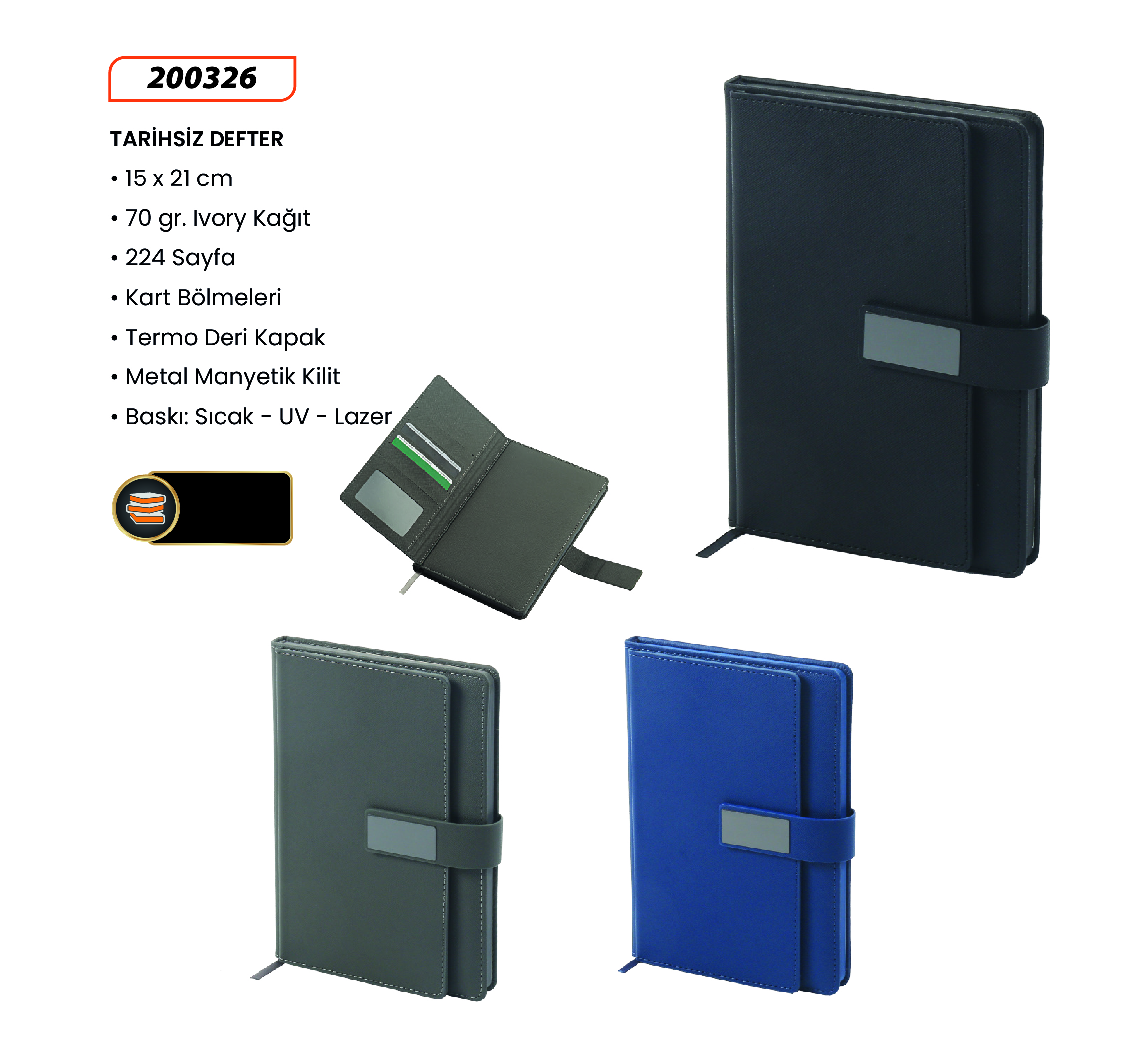 13 x 21 Termo Deri Mıknatıslı Kapak Kağıt: 70gr. Ivory Krem Sayfa Sayısı: 224 Baskı: Sıcak – UV – Serigrafi