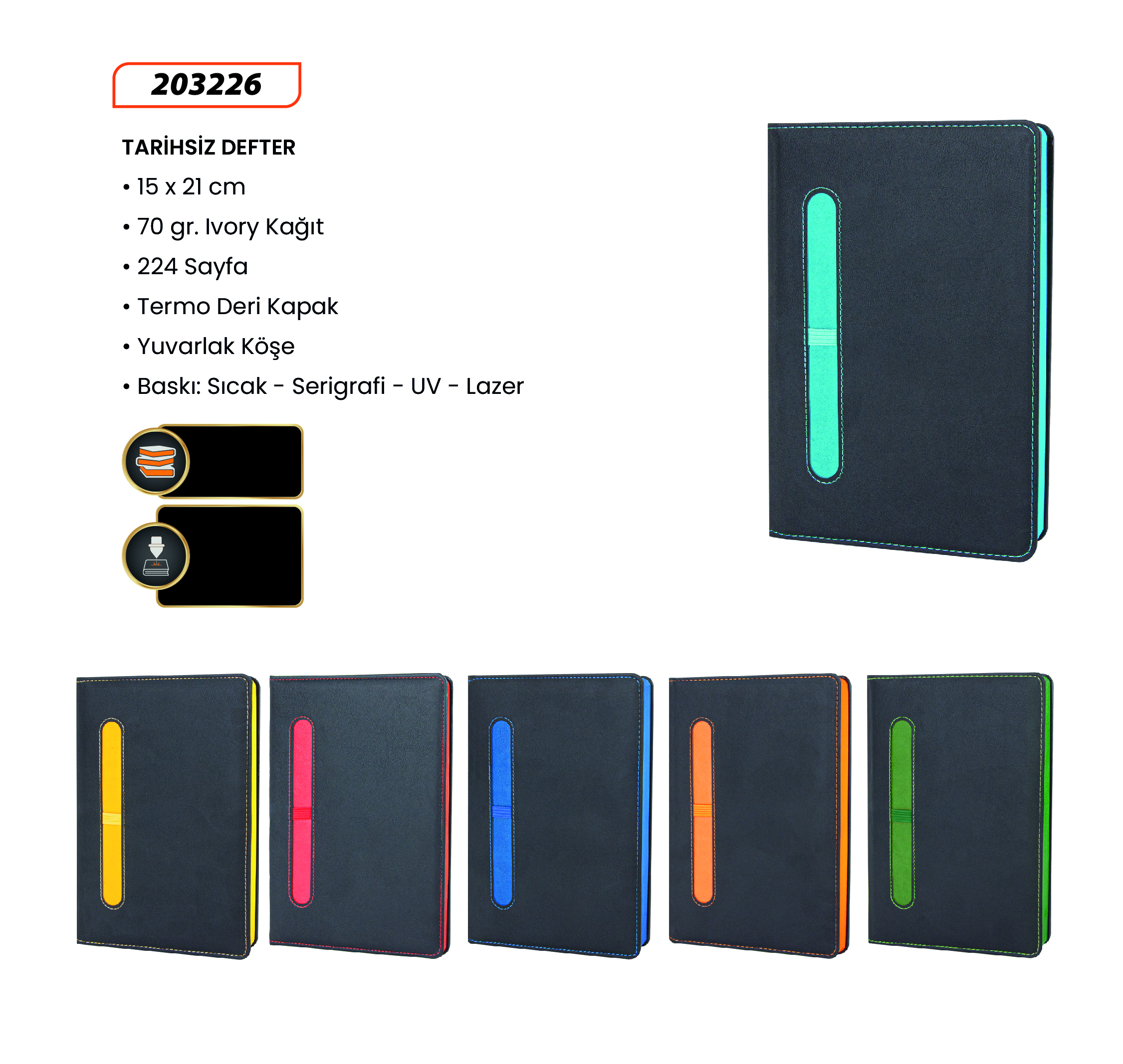 13 x 21 cm Kağıt: 80gr. Ivory Sayfa Sayısı: 224 Çizgili. Baskı: Gofre-Dijital-Lazer Kapak: Termo PU Sert Kapak Renkli Kenar