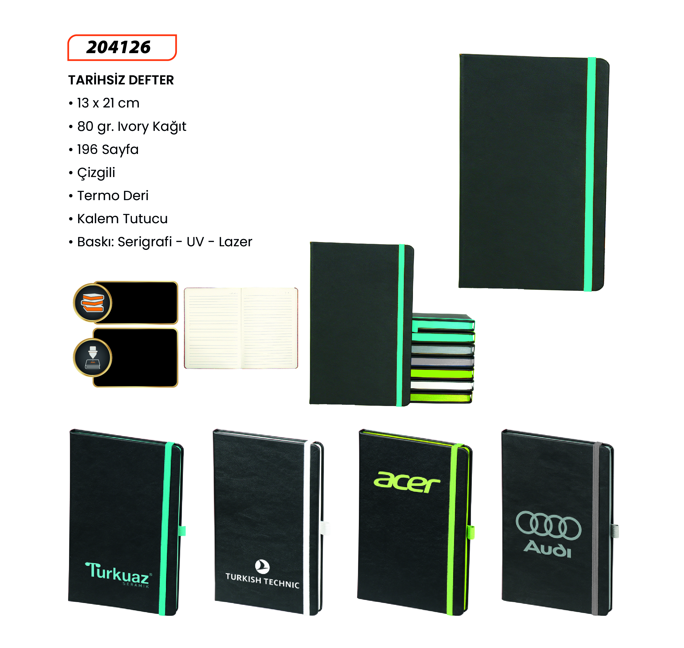13 x 21 Termo Deri Mıknatıslı Kapak Kağıt: 70gr. Ivory Krem Sayfa Sayısı: 224 Baskı: Sıcak – UV – Serigrafi