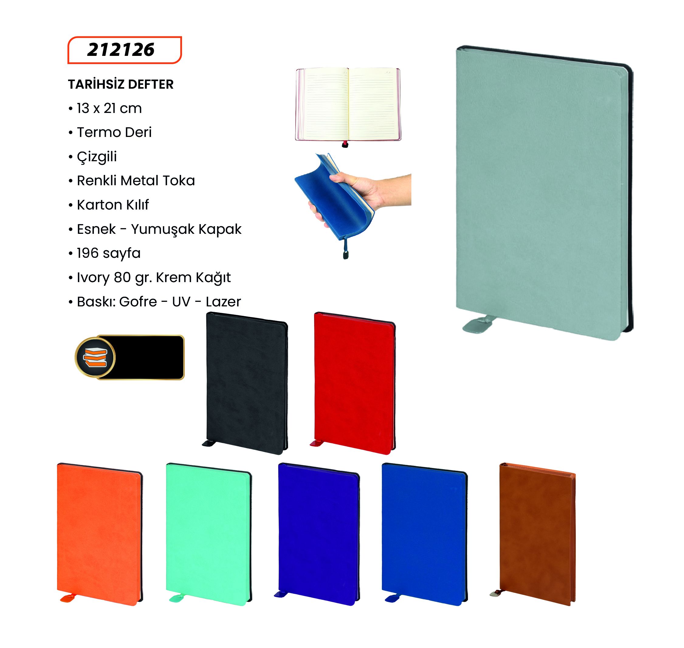 13 x 21 Kağıt: 70gr. Ivory Krem Sayfa Sayısı: 196 Çizgili. Baskı: Gofre-Dijital Kapak: Termo PU Sert Kapak Esnek Lastikli