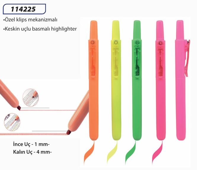 Ana SayfaKALEM GRUBUPlastik Kalemler 114225-KESKİN UÇLU BASMALI HIGHLIGHTER